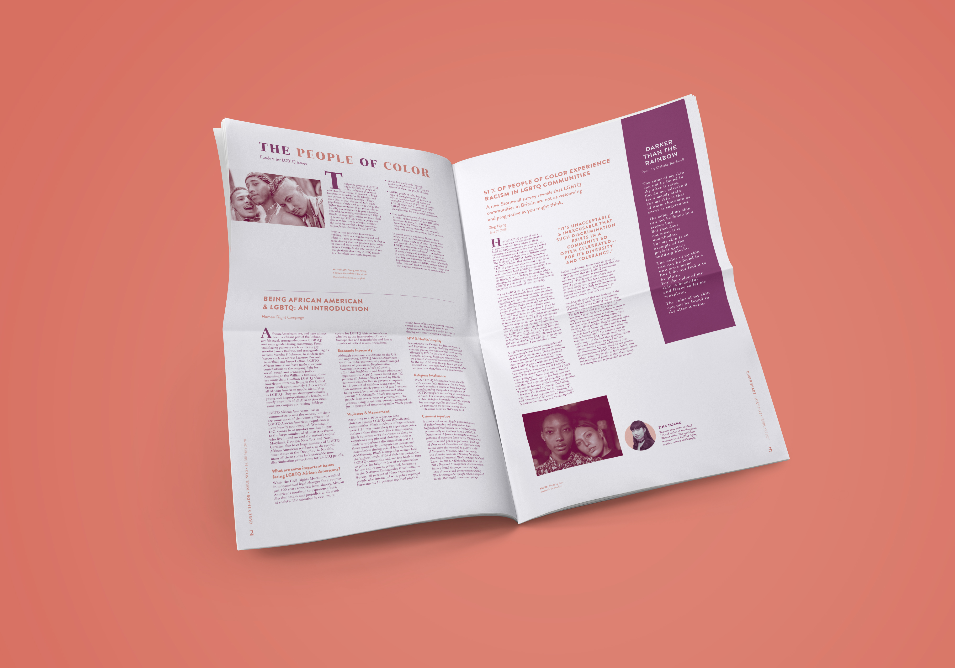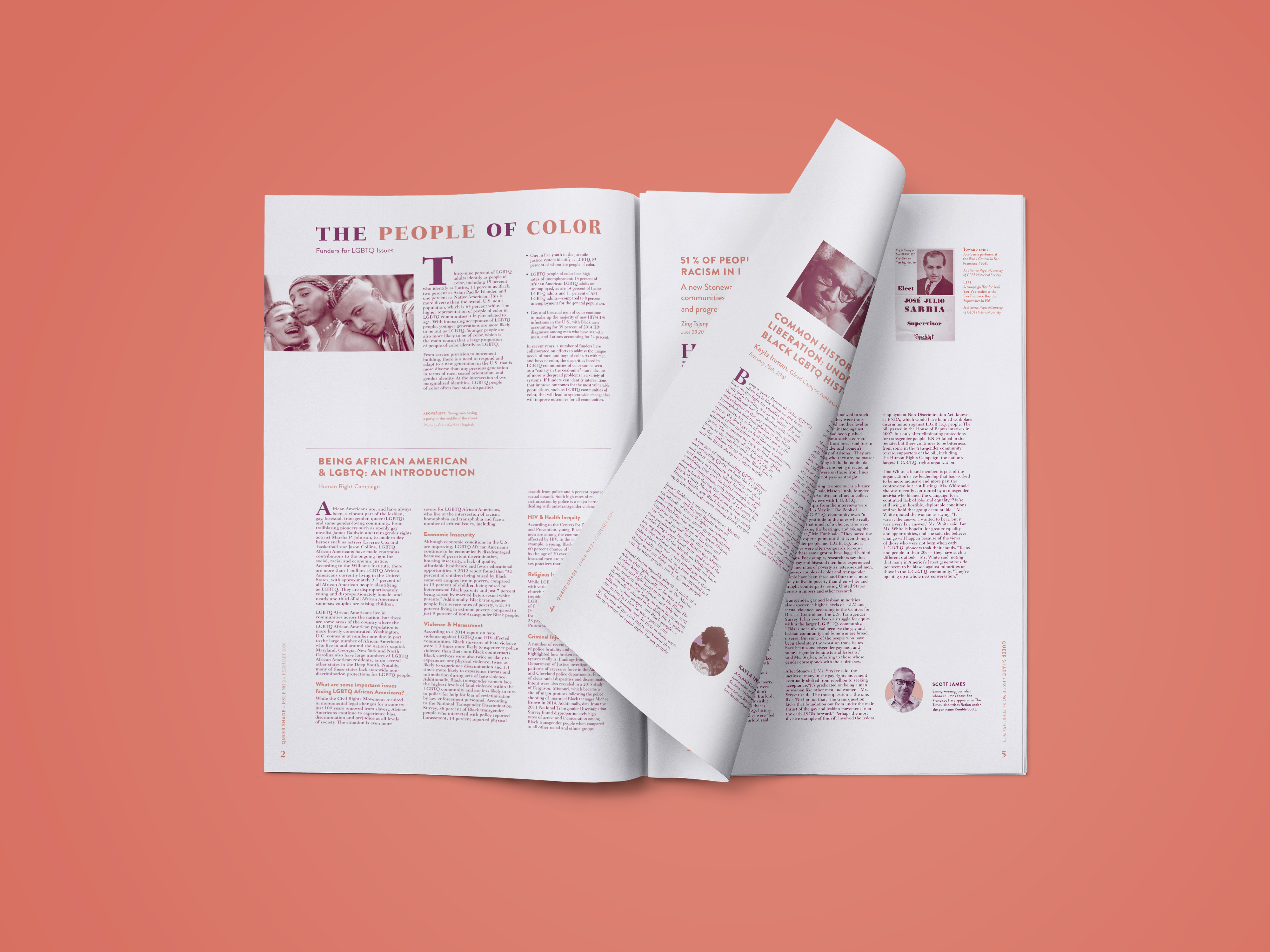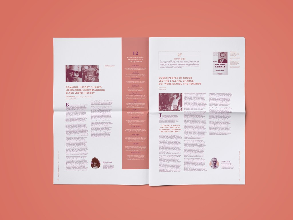 This project was a unique endeavor as it marked my initial effort in crafting a long-form editorial. Titled “Queer Shade,” it highlights LGBTQA+ individuals of color and features articles, statistics, and literature.
