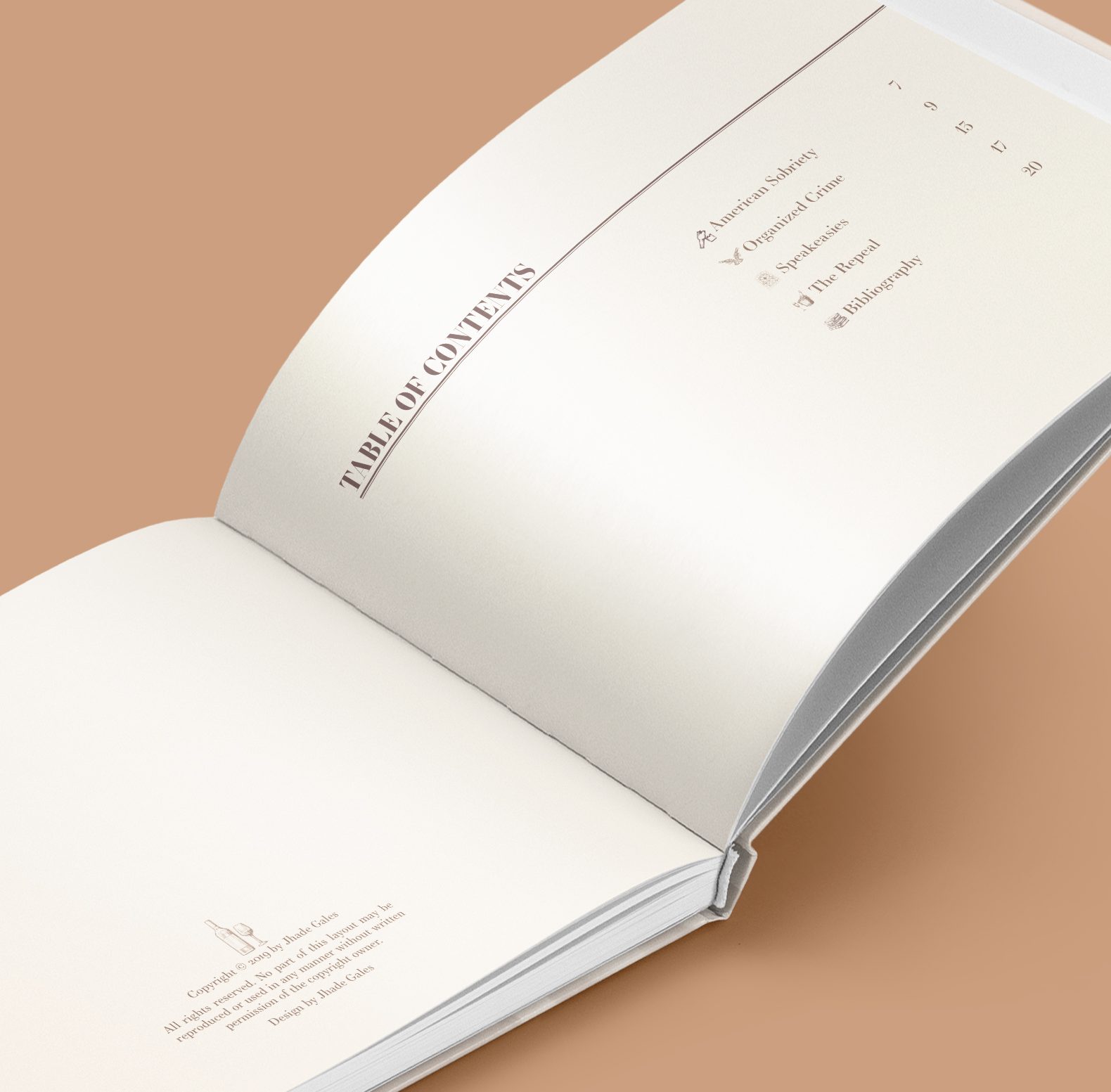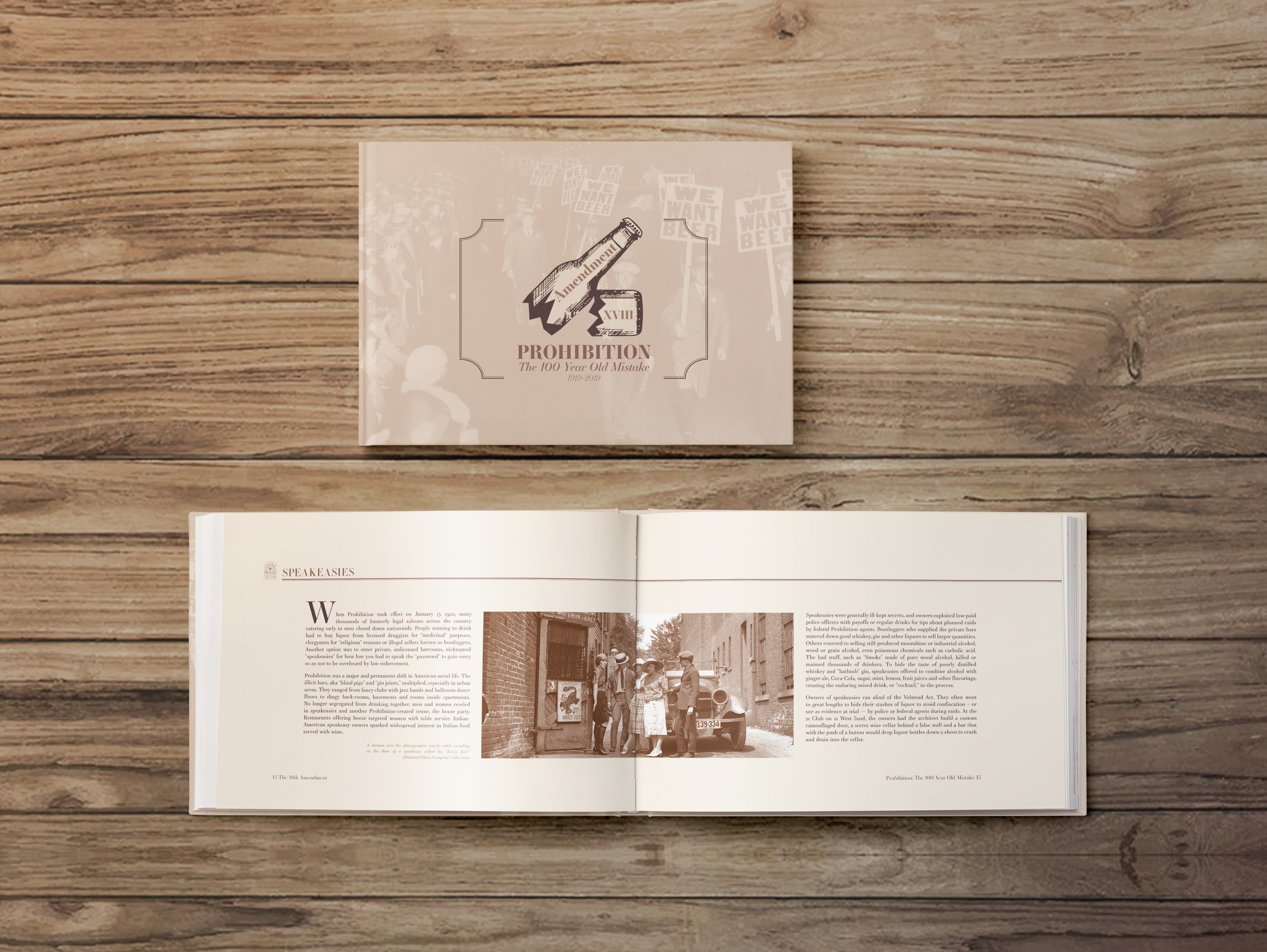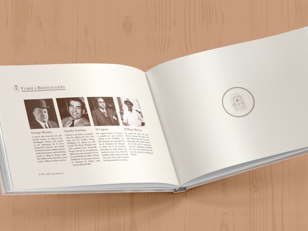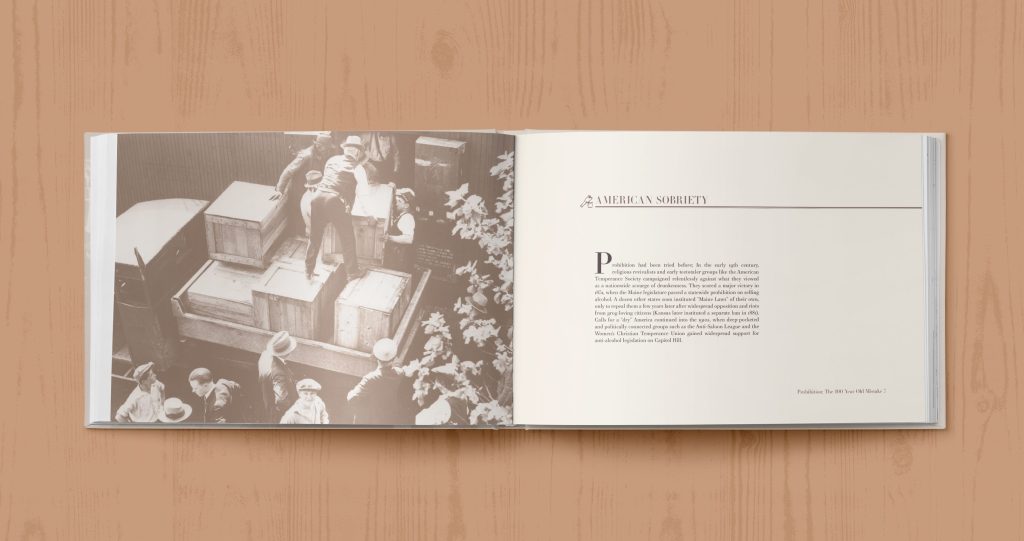 This commemorative book called for a design that echoed the spirit of a century past. Inspired by 1920s-era print styles and archival imagery, the layout blends thoughtful typography with restrained color palettes and vintage visuals. The result is a modern publication that feels rooted in history—inviting readers to engage with the Prohibition Era through a respectful and refined editorial lens.