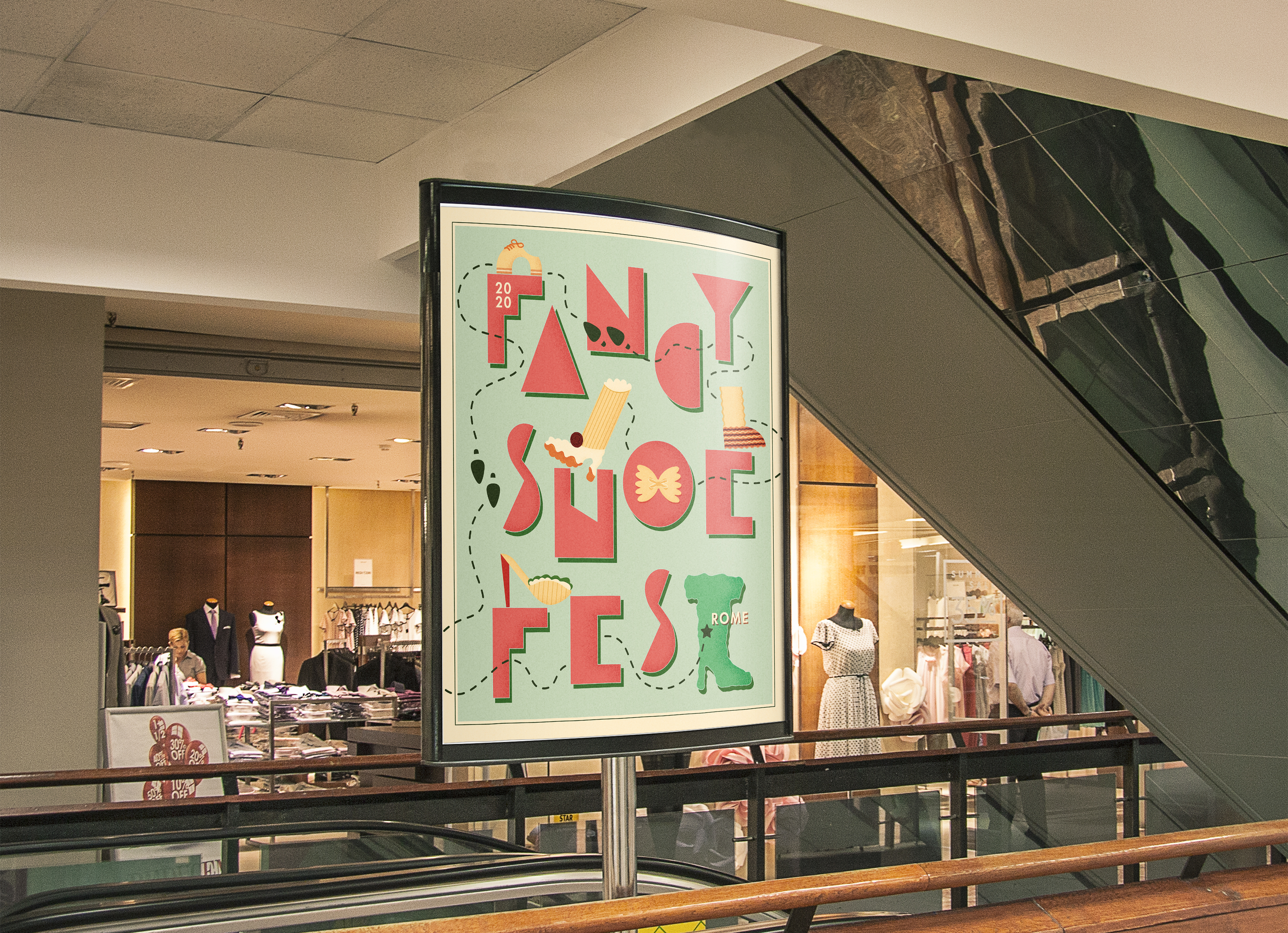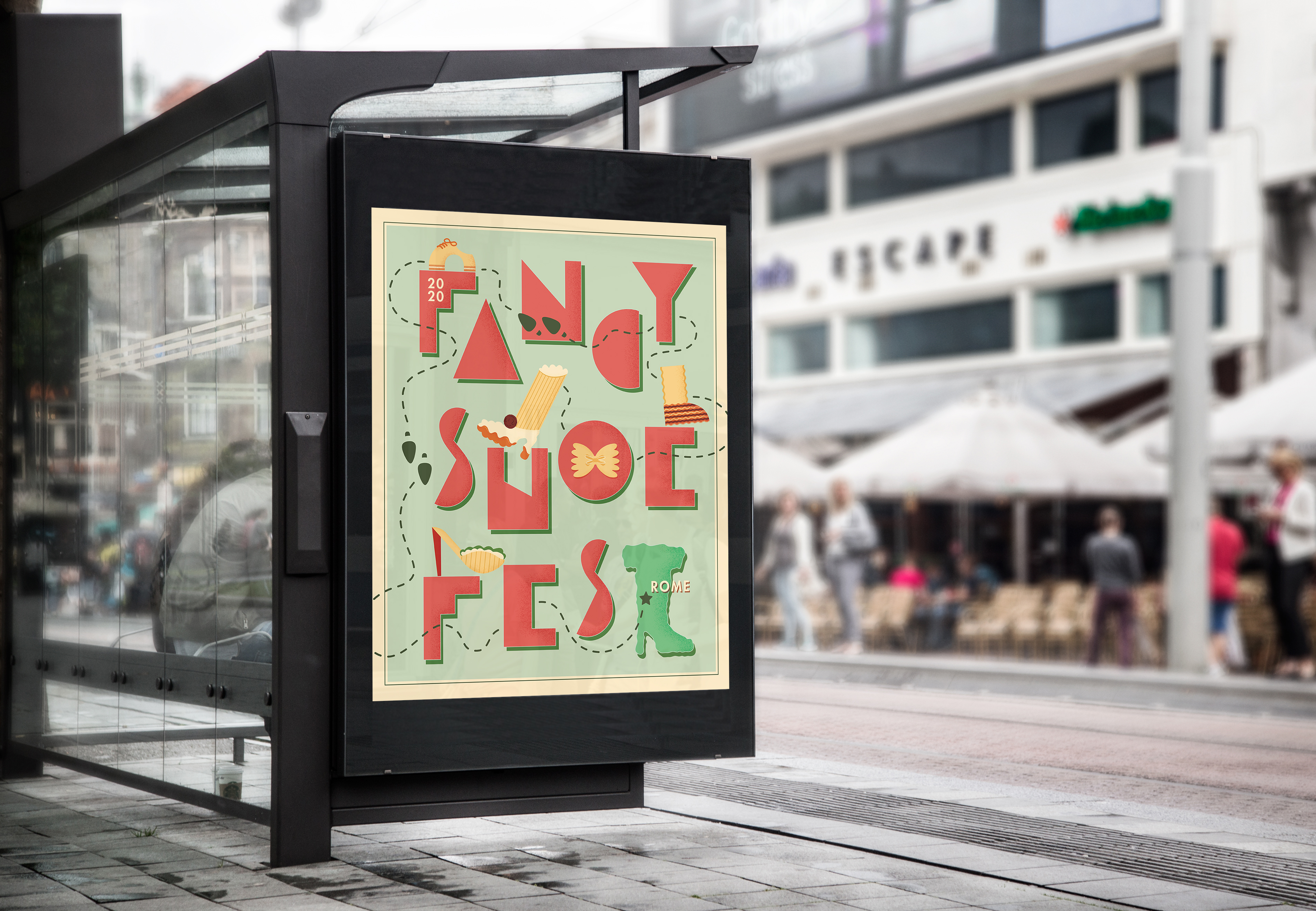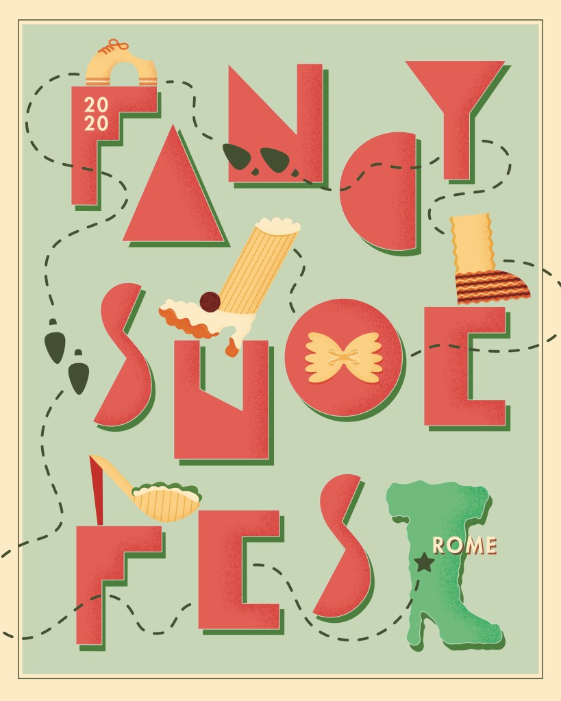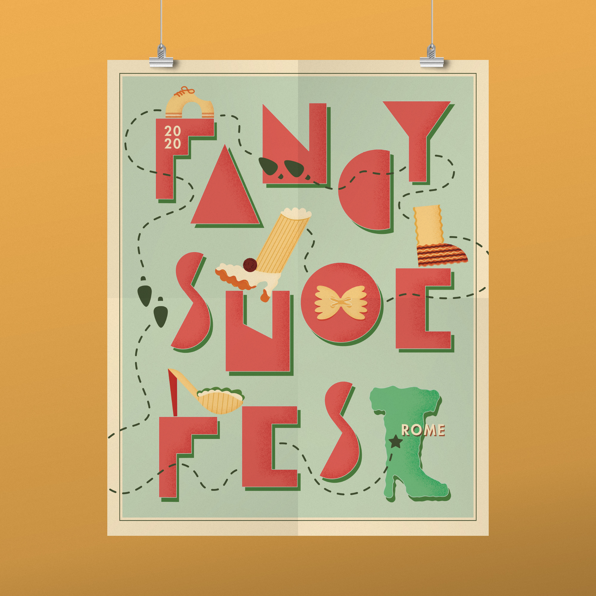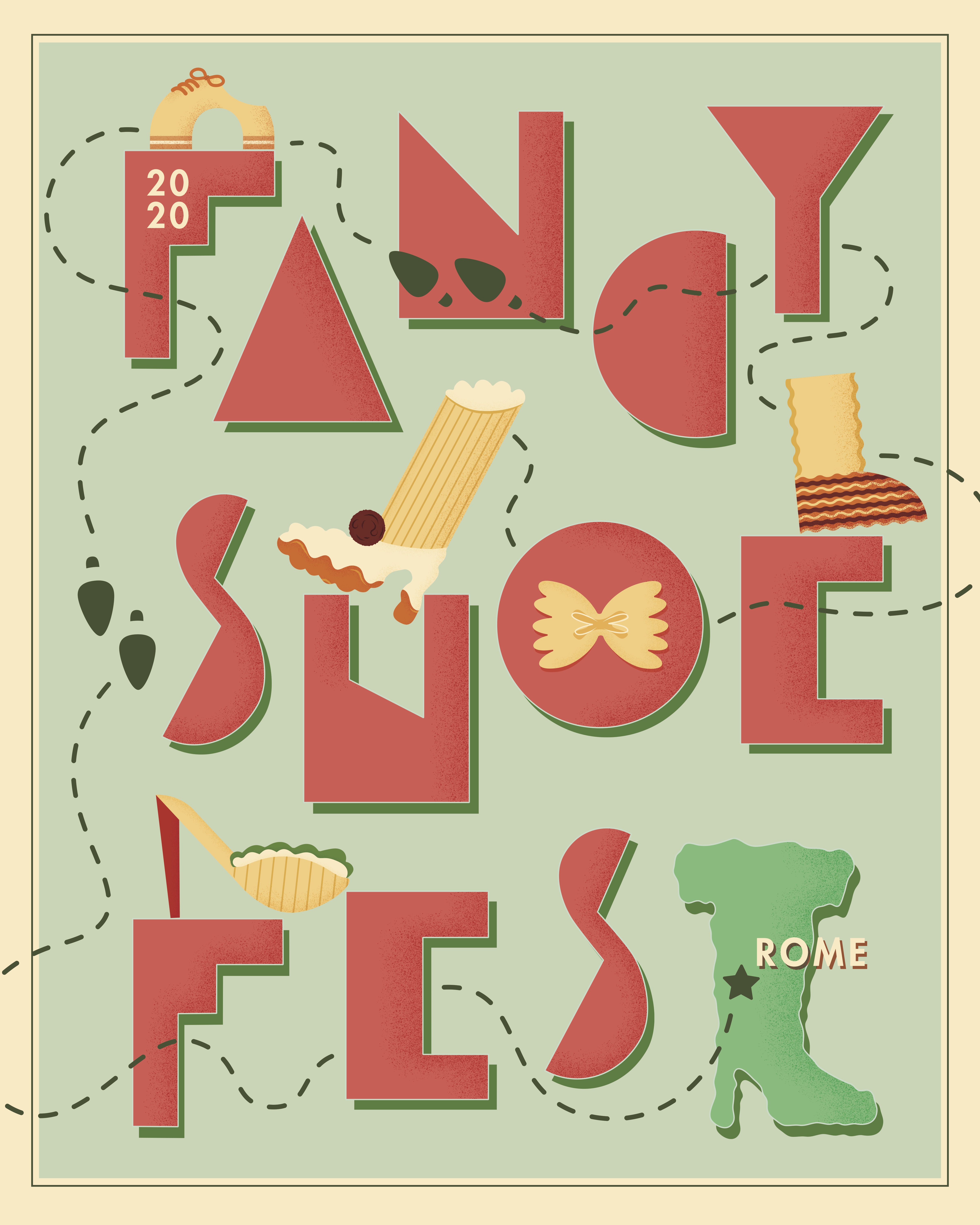This poster and logo were designed to promote the Fancy Show Festival, a fictional event in Rome. The ultimate theme featured Italianesque lettering, delicate grain shading, and footwear made of pasta.