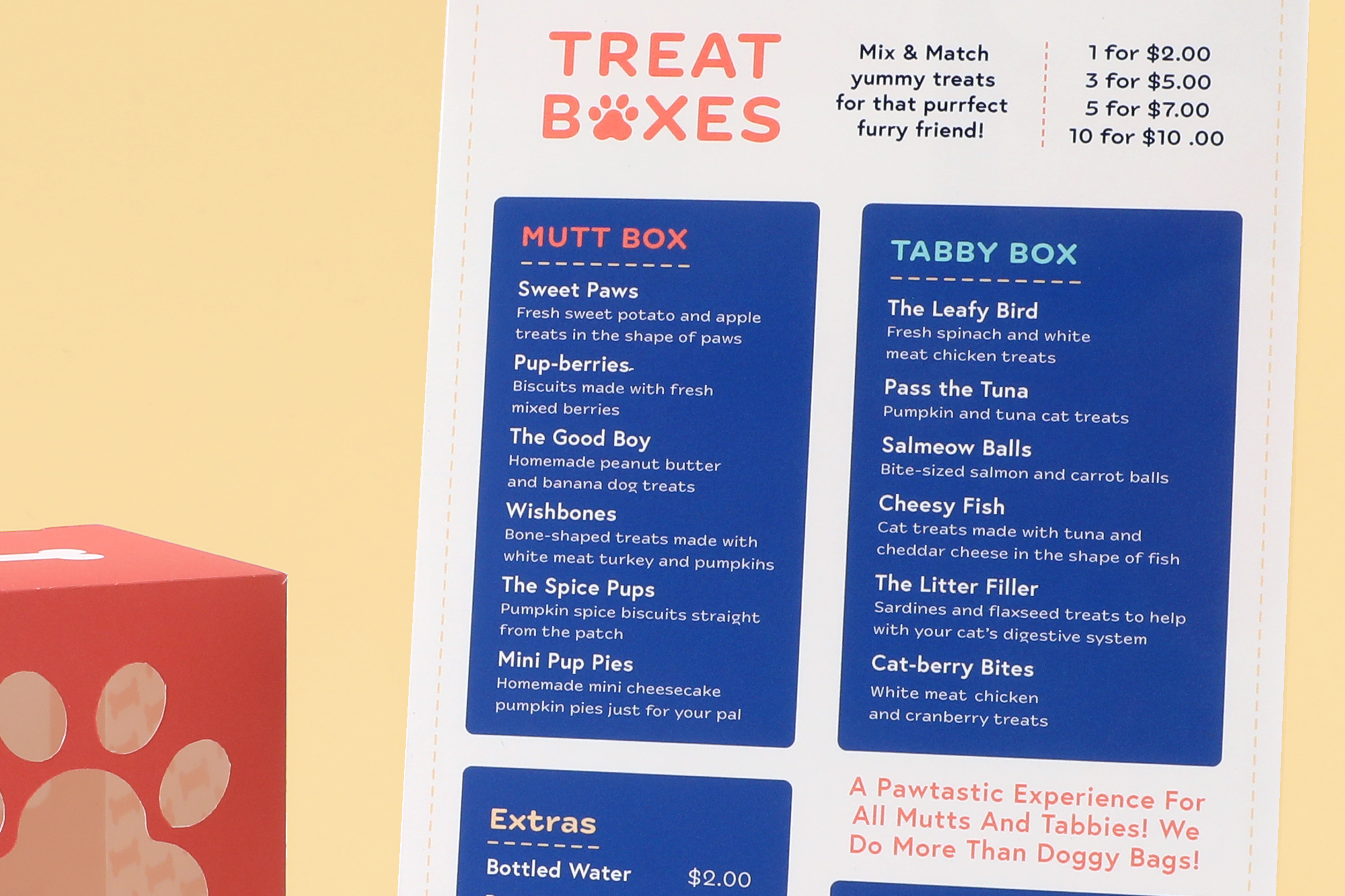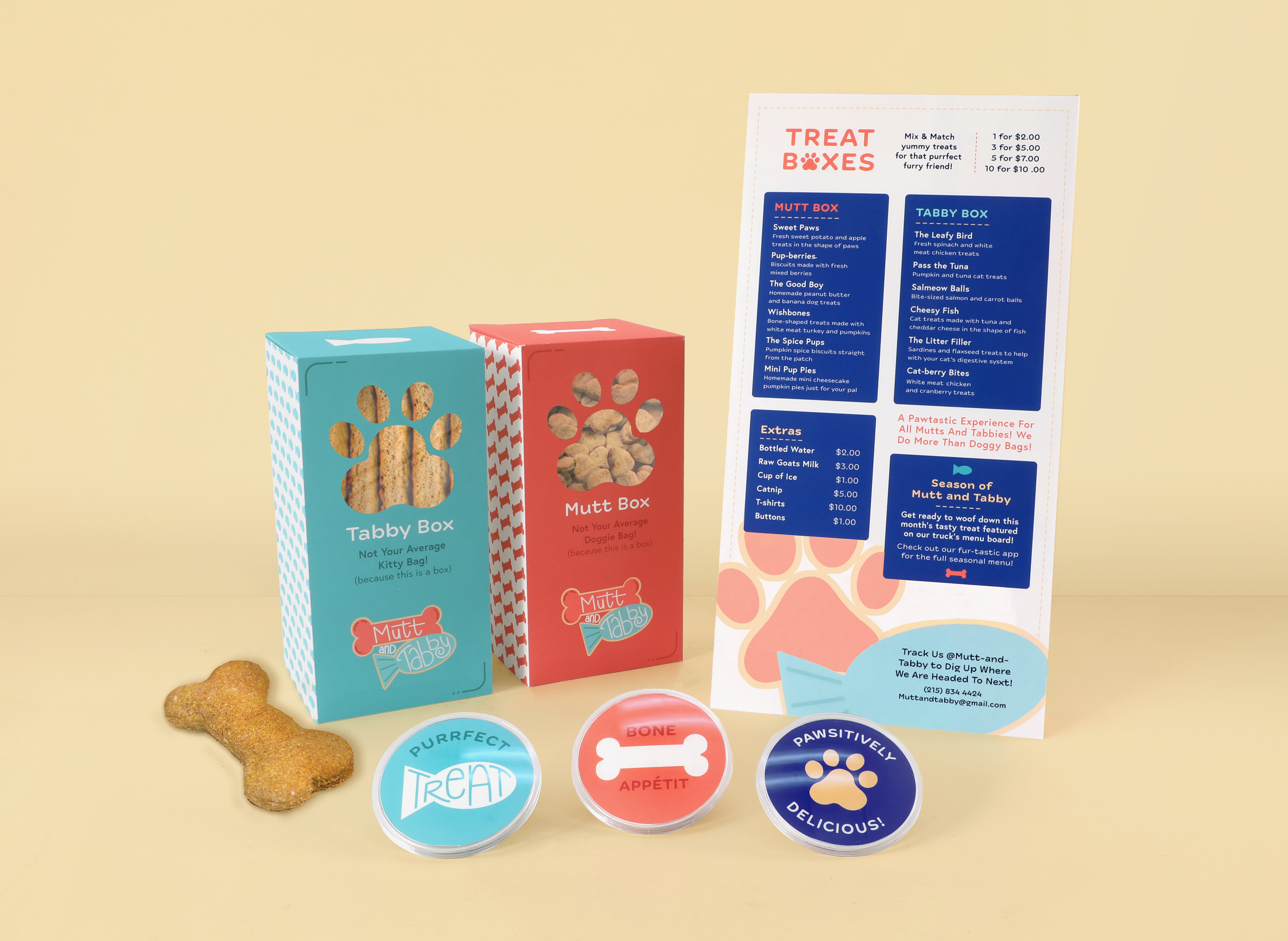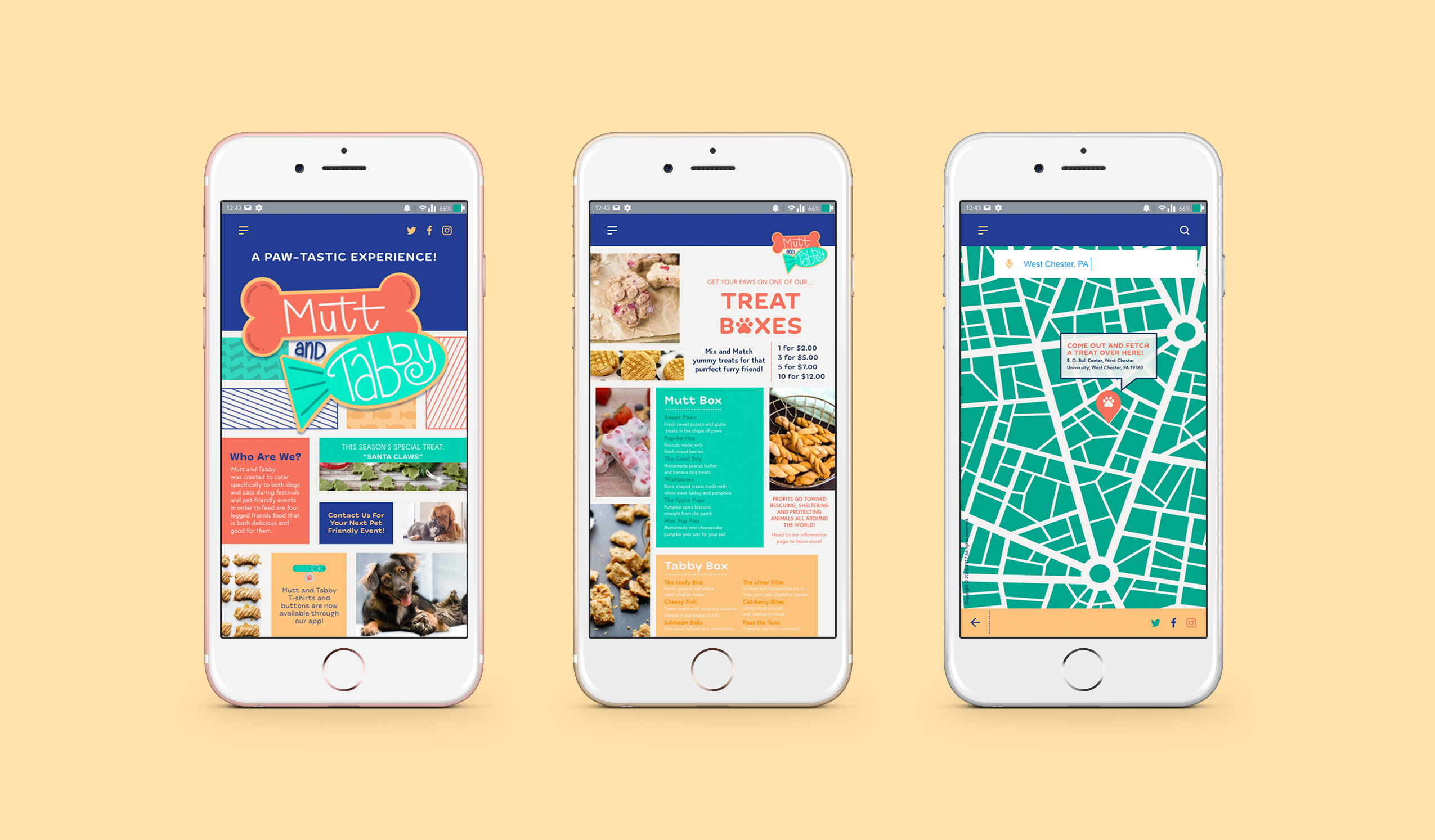 Mutt and Tabby was a branding project centered around a food truck that caters exclusively to cats and dogs—hence the name. The project included branding, touchpoints, a truck mock-up, and app screenshots.